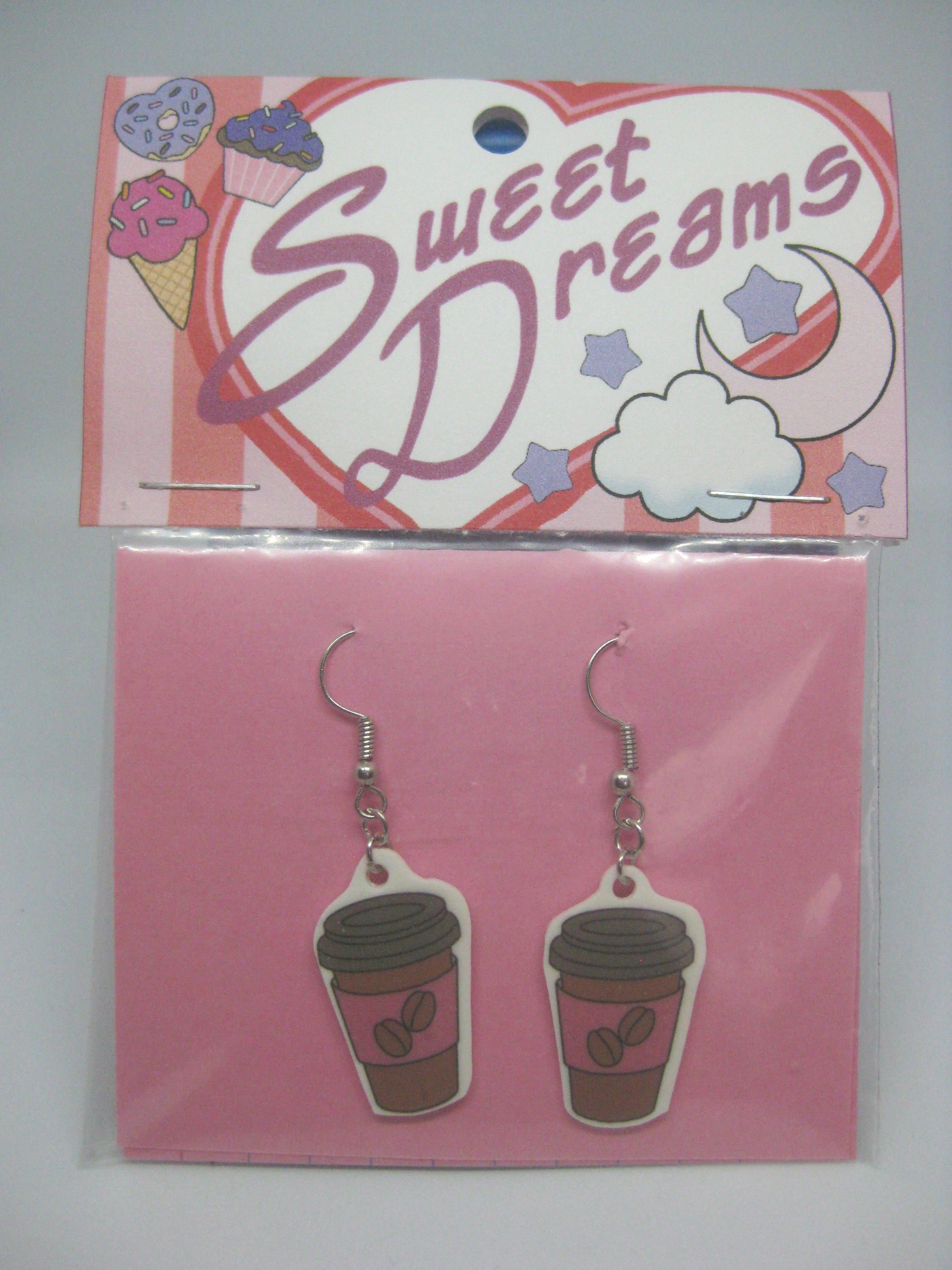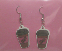 Hand-made, hard-plastic earrings featuring festive coffee cups. Findings are nickel-free, rhodium-finish. (So they should be okay for sensitive ears.) Charms are hard-plastic sealed with enamel. Entire earing length is approximately 2 inches.