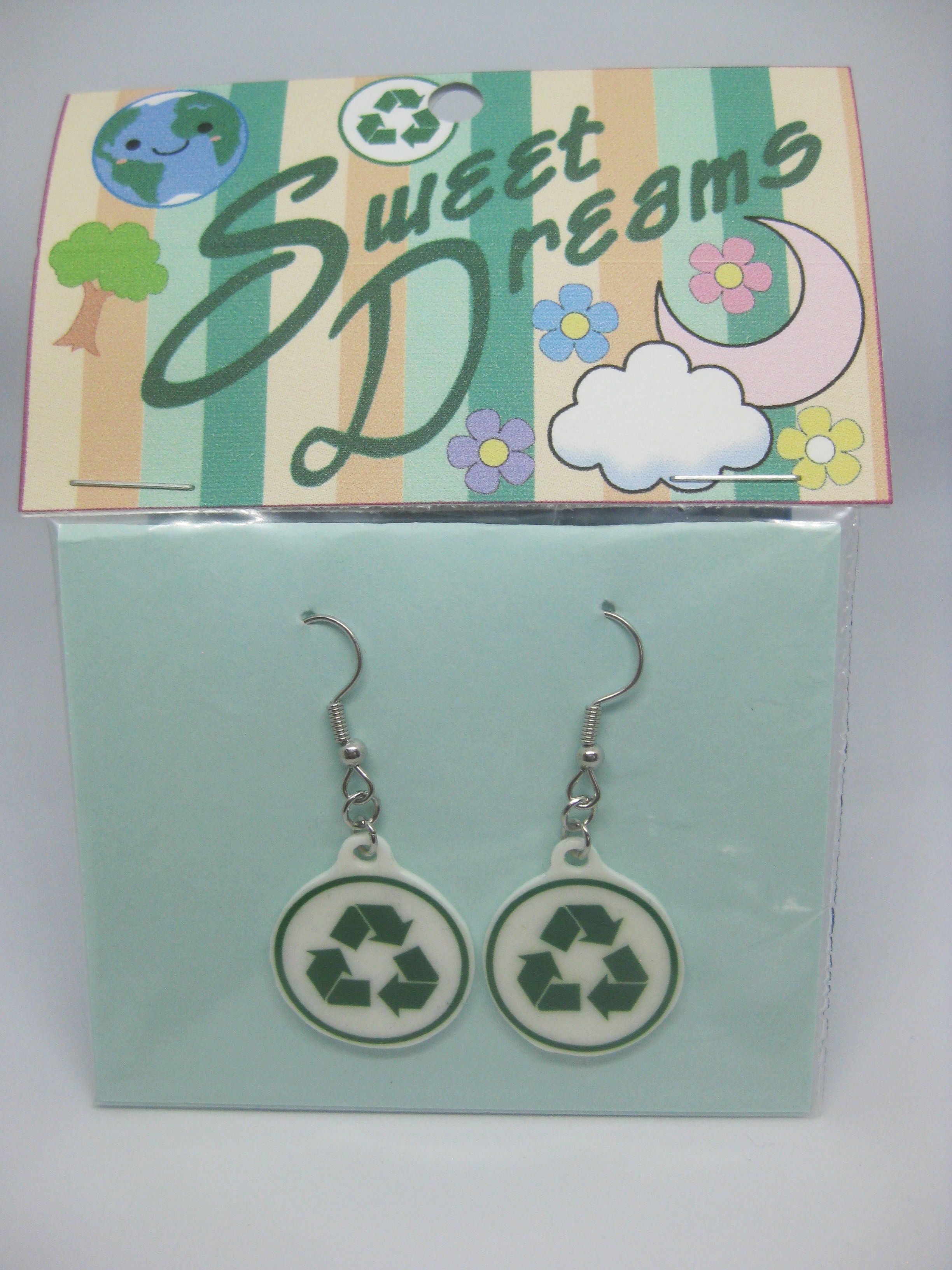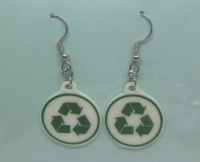 Hand-made, hard-plastic earrings featuring recycling symbols. Findings are nickel-free, rhodium-finish. (So they should be okay for sensitive ears.) Charms are hard-plastic sealed with enamel. Entire earing length is approximately 1 & 3/4 inches.