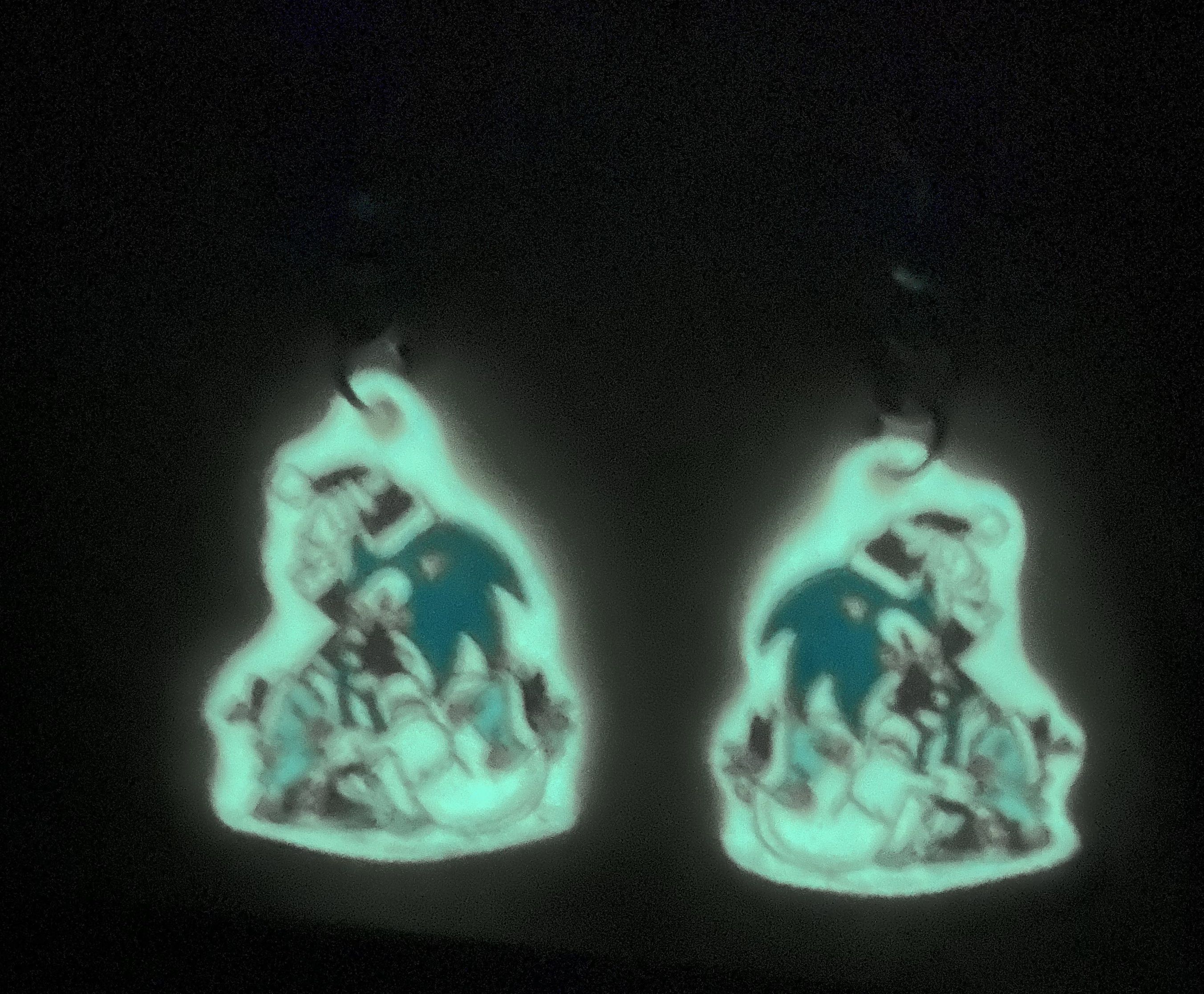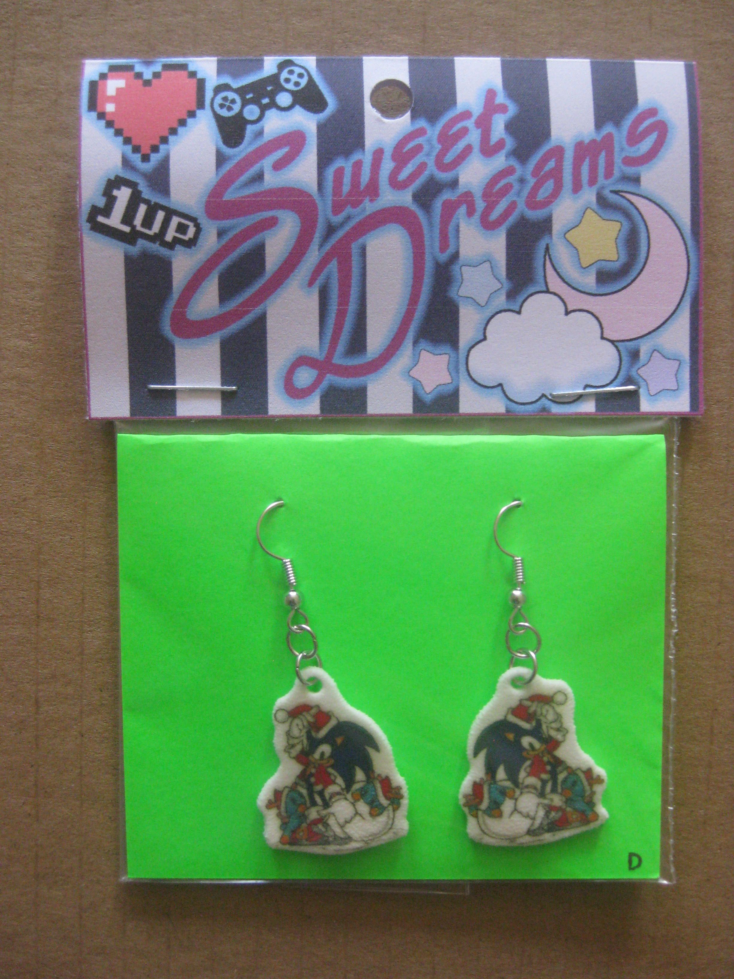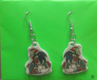 Imperfect, hard-plastic earrings featuring Christmas Sonic and some chao. Charms are hard-plastic sealed with enamel. Entire length is approximately 1 and 3/4 inches.